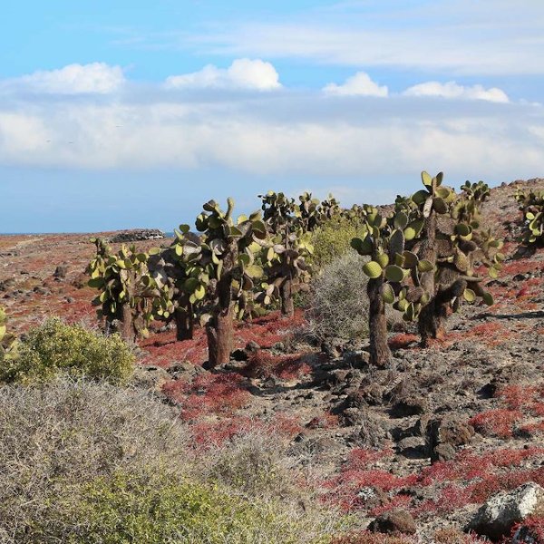 South Plaza is one of the smallest islands in Galapagos. It was formed through the uplifting of an underwater volcano. Here, you can find the largest population of land iguanas, making their home through the magnificent forest of Cactus Opuntia, which is their main source of food during the dry season. By walking towards the highest point (82ft), you can also spot sea lions, marine iguanas, and tropicbirds like blue-footed and Nazca boobies or swallow-tailed gulls. South Plaza Island is the only place you can find Galapagos hybrid iguanas, as the land and marine iguanas live together on the island.